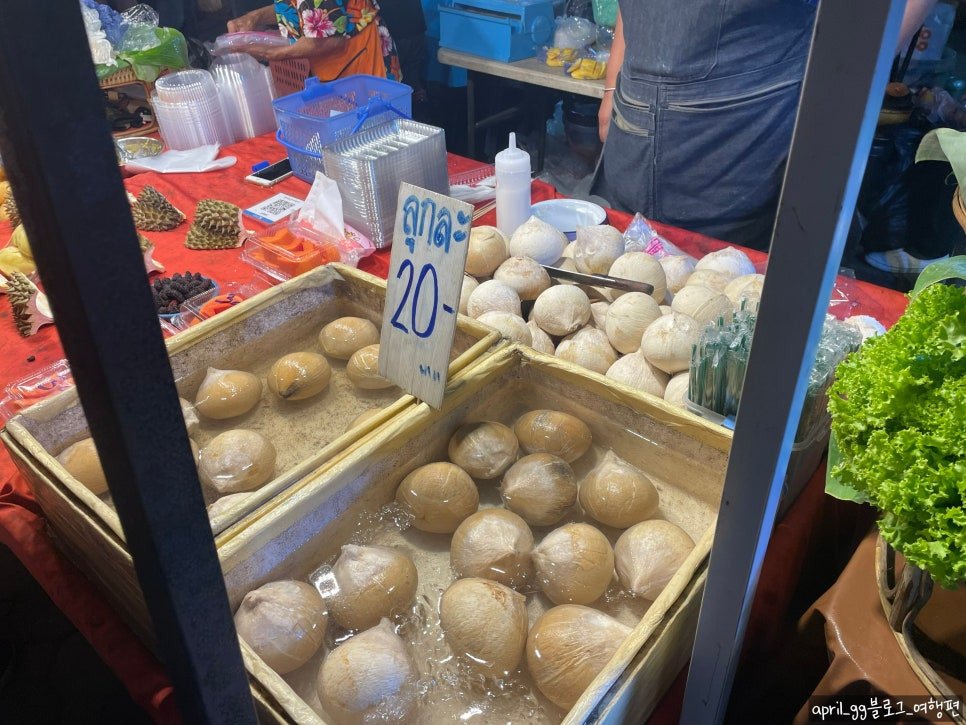 이 곳에서 작은 코코넛을 20바트에 하나 먹고,